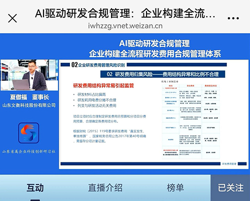 本次直播课程由山东省属企业数字化转型工作专班、山东省科学技术协会学会服务中心、山东省创新战略研究院主办,山东省科技服务业协会与山东企业科技创新研习社联合承办。课程从“新形势”下的研发费用监管政策和发展趋势、企业研发费用管理风险识别及案例分享、企业如何构建全流程研发费用合规管理体系、AI驱动企业研发费用合规与智能管理等多个维度进行了详细解读,并就直播间相关提问进行了现场解答。