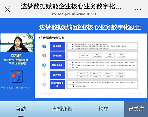 1月30日,“山东科技创新云讲堂·创享视界”专栏第十六期开讲。本期课程邀请达梦数据技术服务中心华北区总经理姚艳玲围绕“达梦数据赋能企业核心业务数字化跃迁”进行了解读。